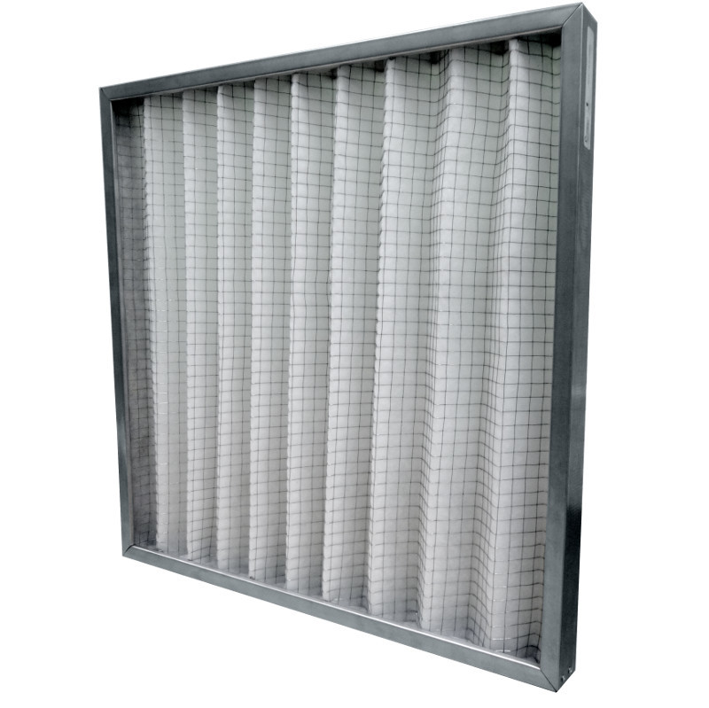 Фильтрующий материал крепится при помощи металлических скоб на гофрированной металлической сетке с оболочкой ПВХ, которая расположена с тыльной стороны фильтра. Крепление обеспечивает одинаковое расстояние между складками, увеличивает прочность конструкции и рабочую поверхность фильтра.