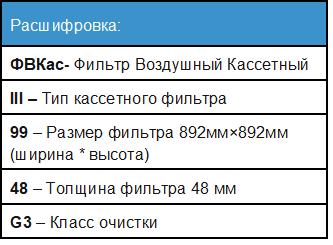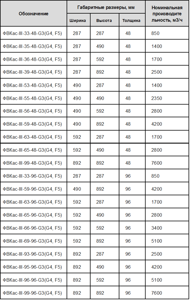 Производительность фильтров ФВКАС-III нестандартных размеров можно посчитать по формуле Qн=Fвх x qн, где Qн – номинальная производительность фильтра, м3/ч , qн - номинальная удельная воздушная нагрузка, м3/ч х м2 (для ФВКАС G4 = 9700 м3/ч х м2), Fвх - площадь входного сечения фильтра, м2.