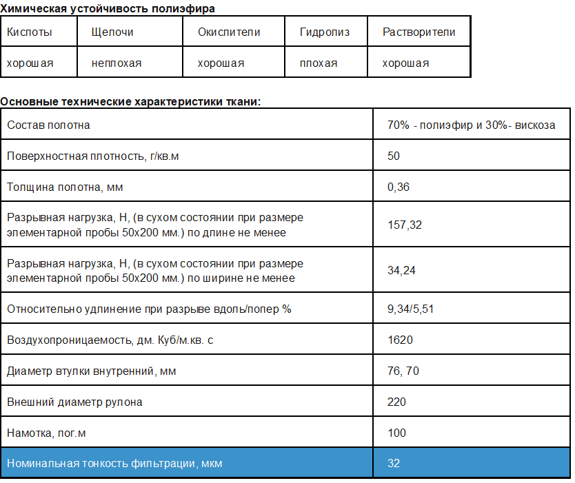 Полиэфирные волокна придают ткани прочность, устойчивость к абразивности, позволяет работать в температурах до 150 град. и имеет хорошую устойчивость к большинству кислот, растворителей и оксидирующих агентов.