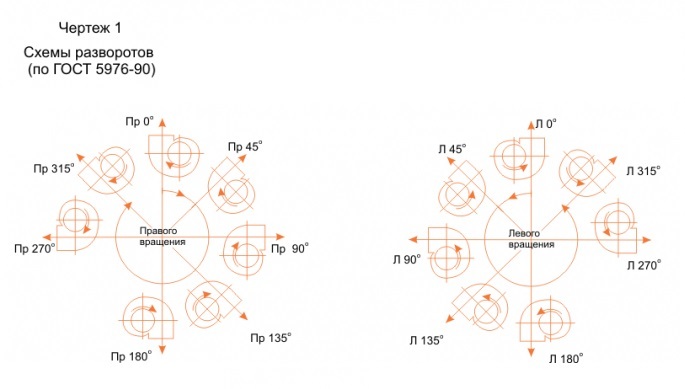 Вентиляторы от № 2,5 до № 12,5 включительно, изготавливаются с поворотными корпусами, допускающими их установку в любое из положений (см. черт.1), а номера выше 12,5 изготавливаются с поворотными корпусами по заказу потребителей. Положение спирального корпуса вентилятора определяют углом поворота относительно исходного нулевого положения. Углы поворота корпуса отсчитываются по направлению вращения рабочего колеса в соответствии с чертежом 1.