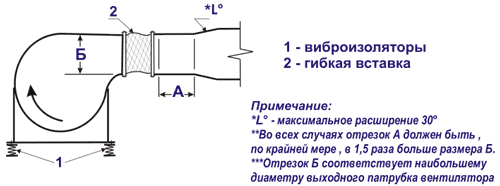 *** Отрезок Б соответствует наибольшему диаметру выходного патрубка вентилятора