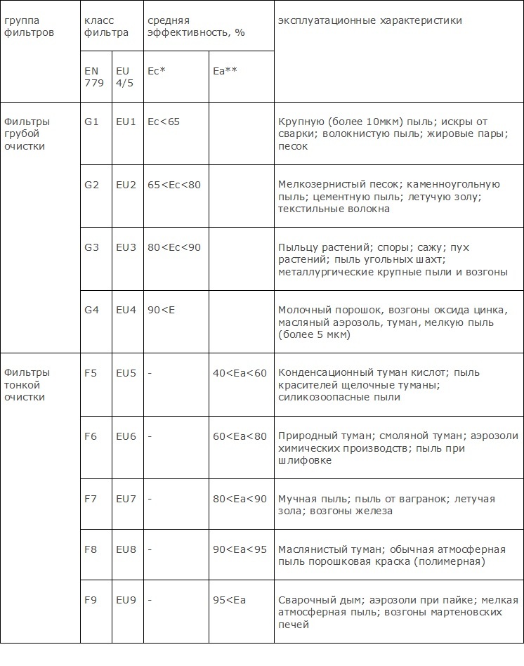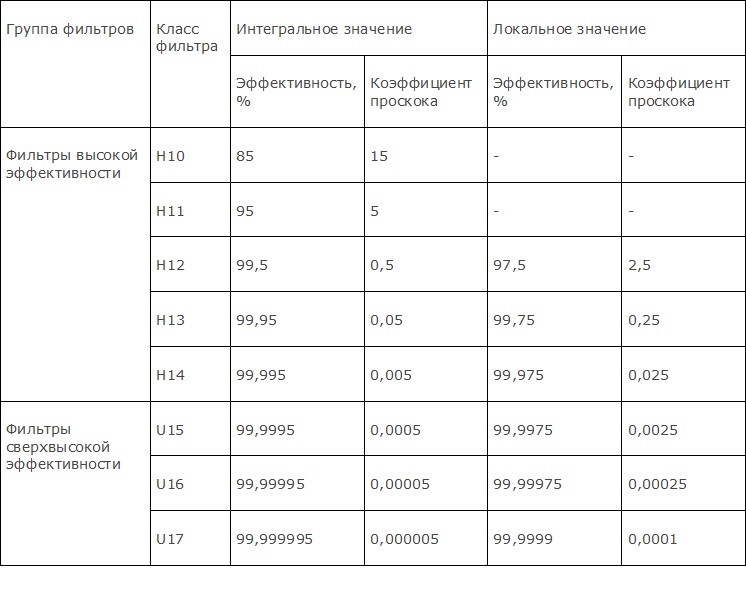 Таблица классификации фильтров высокой и сверхвысокой эффективности