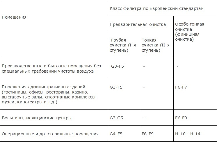 Рекомендуемые классы фильтров для очистки воздуха в различных помещениях